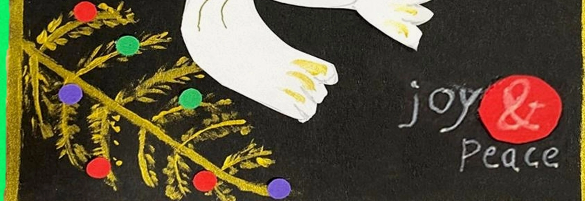 Christmas Card 1 - "Joy & Peace" (£6 per pack of ten with envelopes + P&P). the elegant "Dove with Christmas trees" image was painted by a refugee friend who is a community member of a Refugee Project which is regularly supported by grants from the London Churches Refugee Fund .